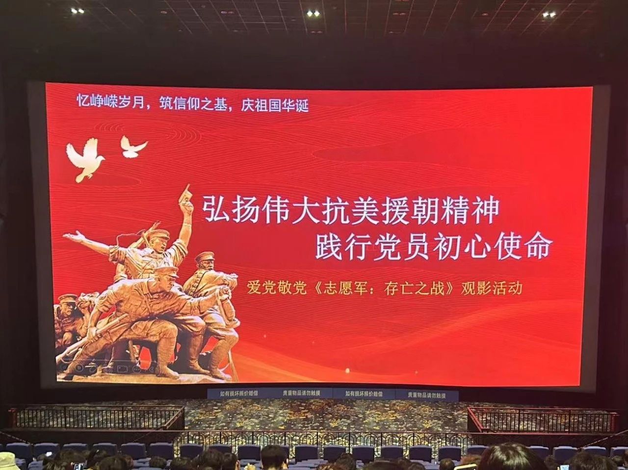 为庆祝中华人民共和国成立75周年,深入学习贯彻中共二十届三中全会精神,推动主题教育走深走实,增强党的凝聚力、战斗力,充分发挥党员先锋模范作用,切实落实立德树人根本任务,弘扬爱国主义精神和学习中国人民志愿军无畏斗争、不怕牺牲、艰苦奋斗精神,提升师生民族自豪感,激发爱国热情,公司党委于10月20日下午组织开展了“忆峥嵘岁月,筑信仰之基,庆祖国华诞”之观看《志愿军:存亡之战》主题党日活动。公司师生党员和员工入党积极分子等近200人参加。